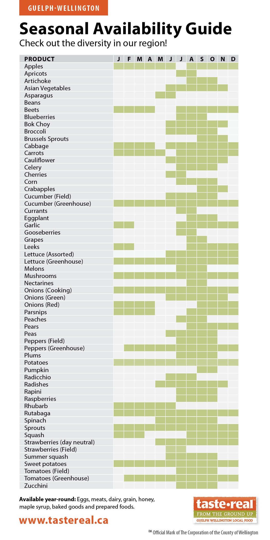Shopping local often means shopping in-season. While some fruit and vegetables can be stored or preserved for consumption later in the year, some only have a short time from harvest to plate. See the availability chart for Wellington County food.